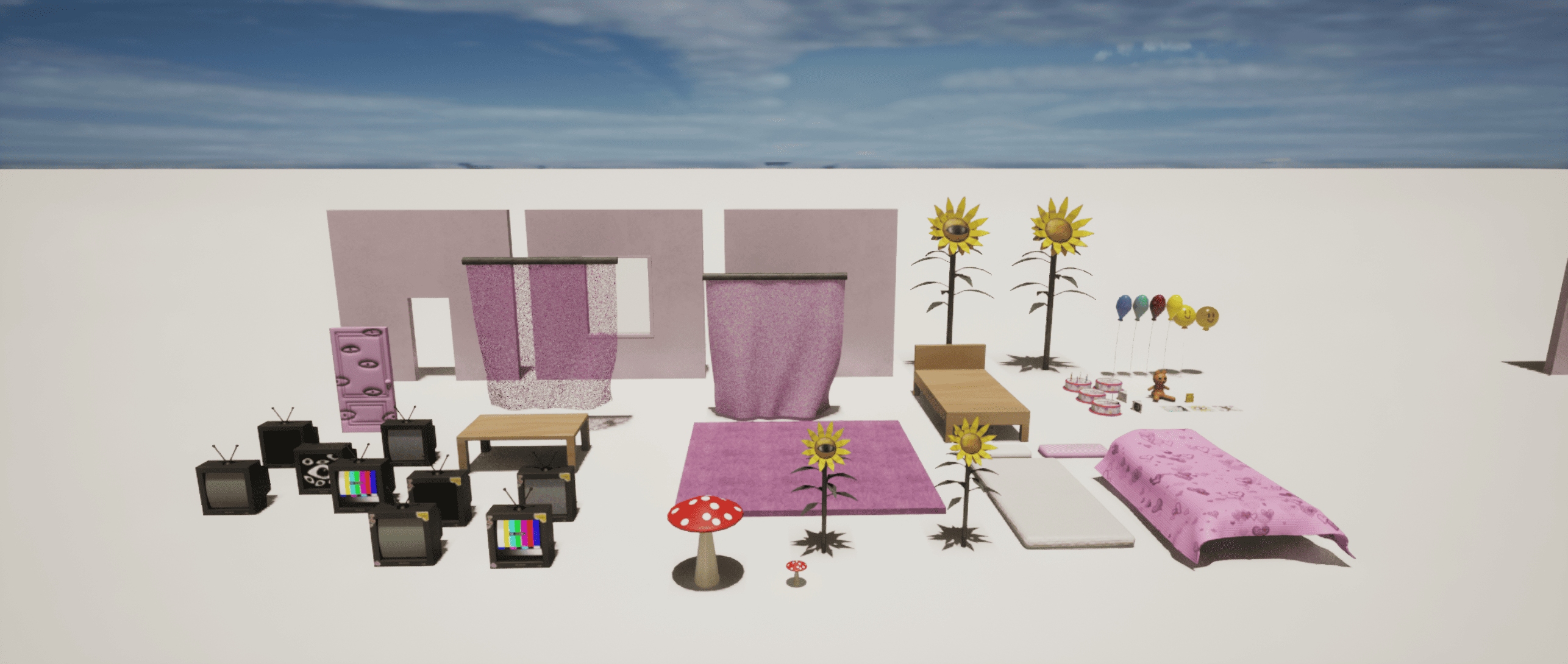 A pack of low poly models and decals to create a Weirdcore horror environment. Some textures were made by me, others were modified from images from Textures.com.