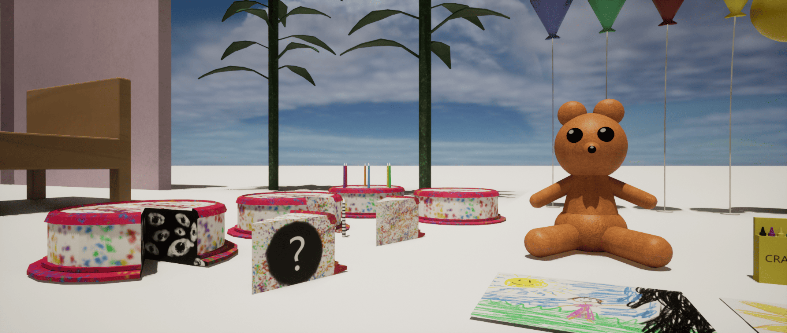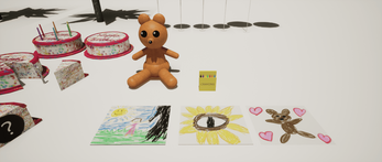 - Birthday cake, balloons, a teddy bear, a box of crayons, and three childish drawings